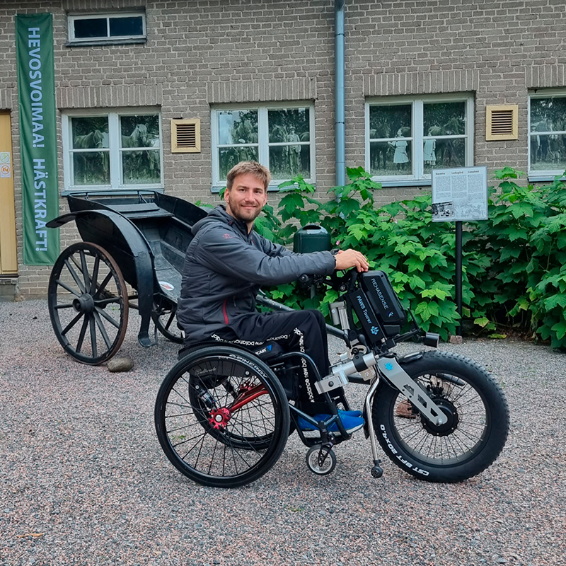 Manuaalipyörätuolilla on todella vaikea pysytellä polkupyörän vauhdissa mukana. Minulla on ihan kunnollinen käsipyörä, jossa maataan selkä melkein tiessä kiinni. Se on kuntoiluun hyvä väline, mutta sen kanssa on vaikea mennä kahvilaan tai siinä ollessa leikkiä lapsen kanssa leikkipuistossa.